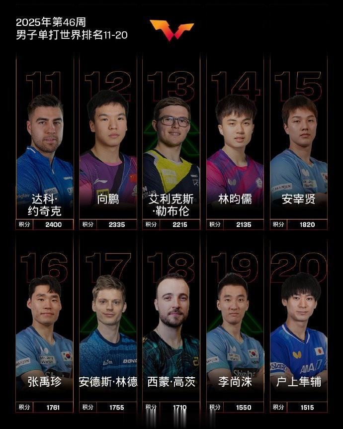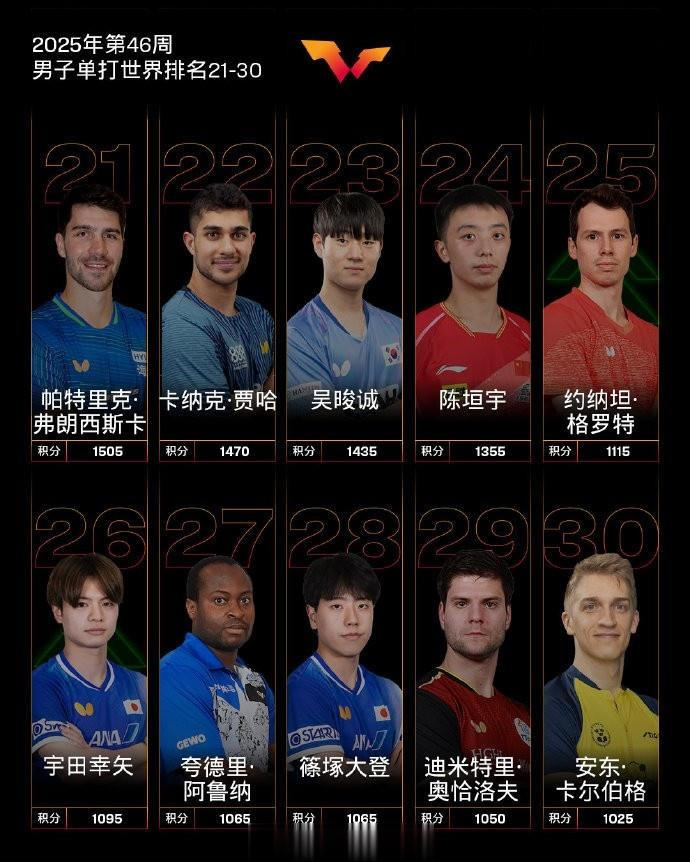 男子单打,中国队球员王楚钦、林诗栋位列前二,梁靖崑位列第六。其他中国队球员,向鹏排名第12,陈垣宇排名第24,周启豪排名第34,陈俊菘排名第45,林高远排名第46,黄友政排名第49。