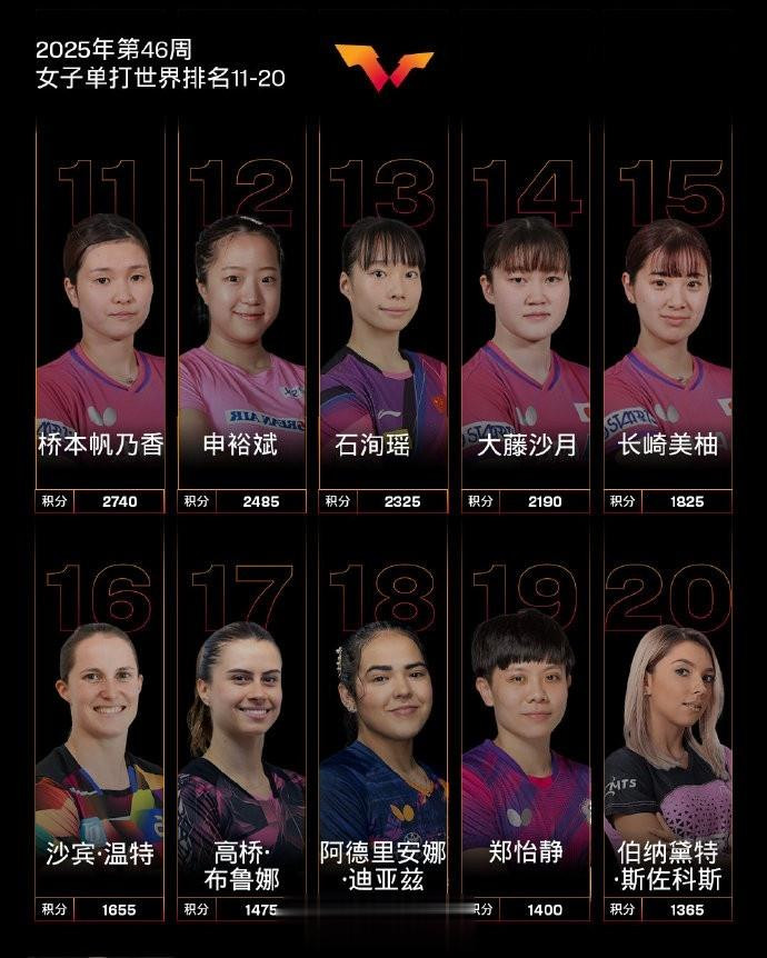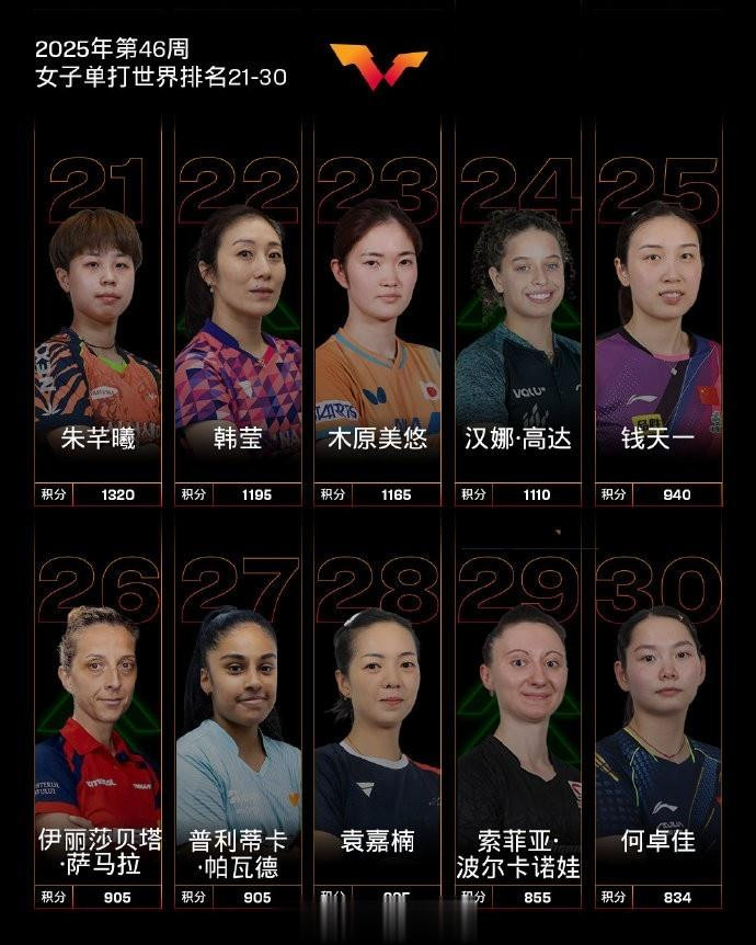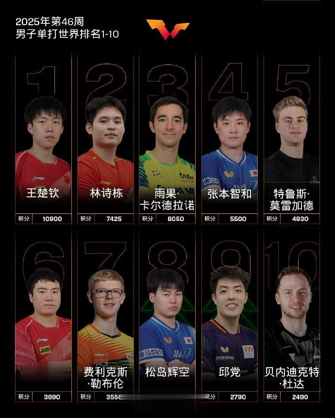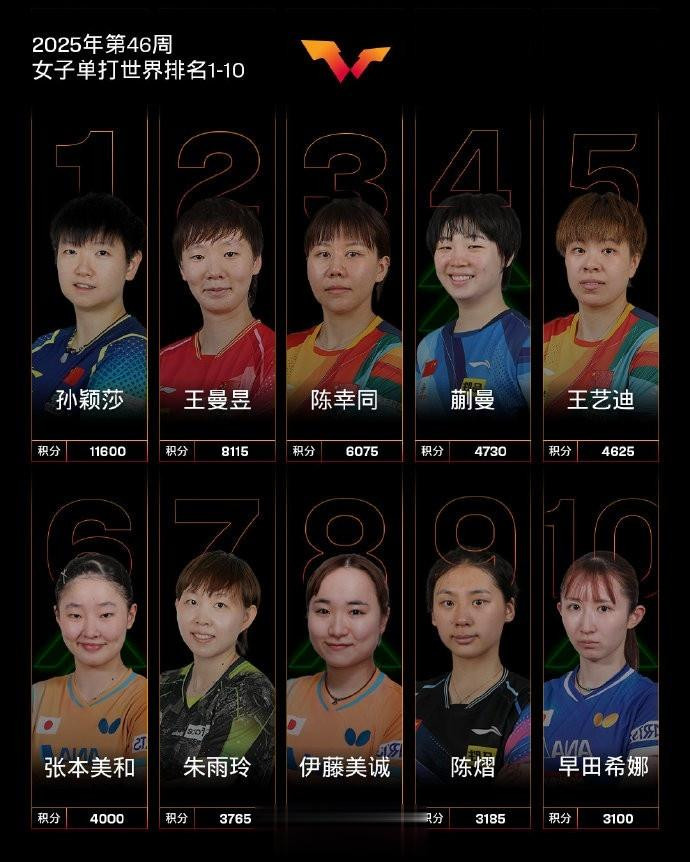 直播吧11月11日讯WTT世界乒联公布最新一期世界排名,王楚钦、孙颖莎领跑男女单,国乒包揽女单前五。
