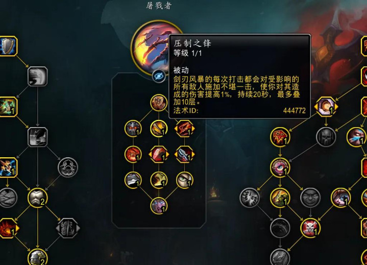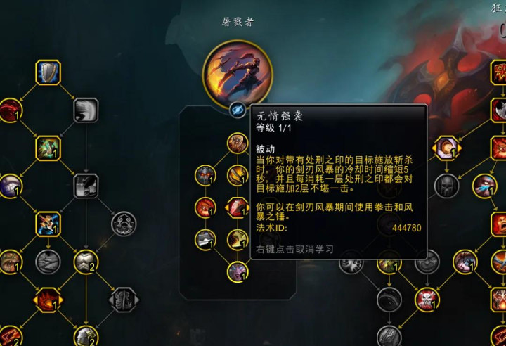 首先是狂暴战屠戮者英雄天赋的“无情强袭”和“压制之锋”天赋,可以让玩家使用剑刃风暴和斩杀的时候对敌人释放“不堪一击”DEBUFF,这个 DEBUFF最多可以叠10层。