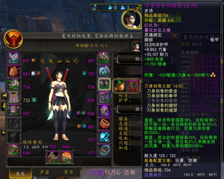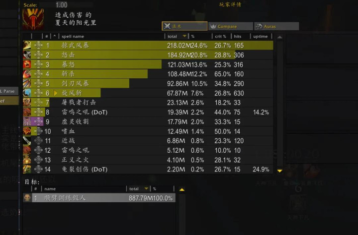 小探就按照最简单的循环简单试一下,有爆发开爆发,每次旋风斩后打2次怒击+1次暴怒+1次斩杀,结果仅有690装等的小战士打5木桩随随便便就打了800万秒伤,要是大家有710装等+优化手法,5木桩肯定是能打1200万以上的。