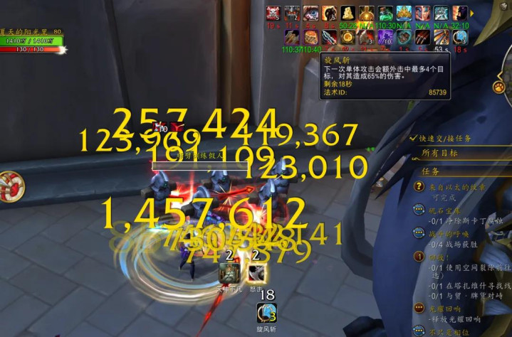 然后就是今天暴雪的热修(实测有效,但是暴雪未发蓝贴),旋风斩可以复制怒击65%的伤害,重点来了,它还能复制怒击触发的“掠武风暴”效果,不仅仅对主目标有效,对其他次要目标也生效。而以前仅能对主要目标有效。
