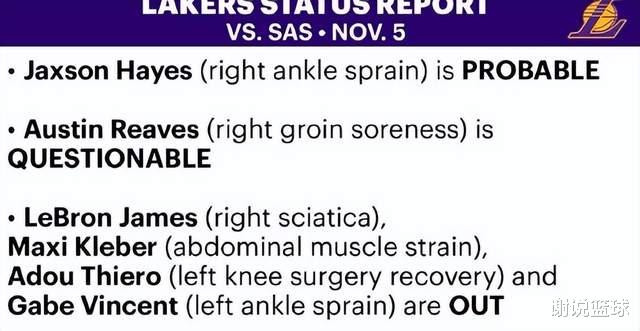 显然这样一场卡位战,无论对于湖人还是马刺,都算迎来关键对决。只不过湖人两名主要轮换,都处于出战成疑状态,奥斯汀-里夫斯因为腹股沟酸痛,进入了伤病名单,此外中锋贾克森-海斯,同样存在右脚踝扭伤情况,只不过他依然会大概率出战。