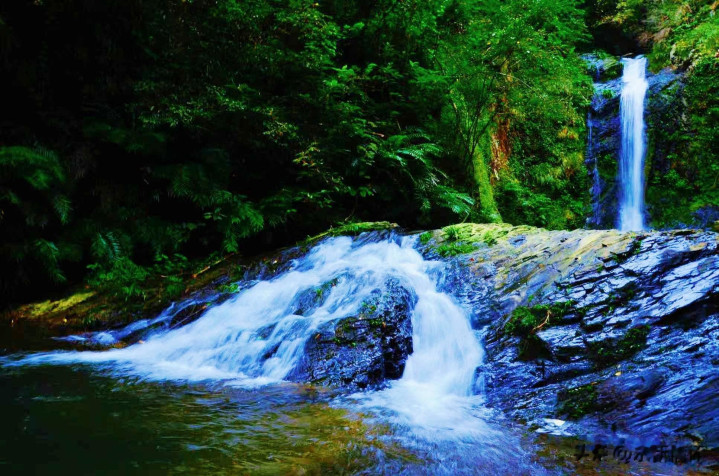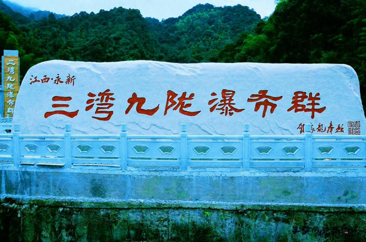 景区入口,一方巨岩巍然矗立,“江西永新·三湾九陇瀑布群”十一个隶书大字镌刻其上,笔力遒劲,乃中国书法家协会会员、永新本土书法家贺家龙先生手笔。巨石背面,“智者乐水,仁者乐山”八字,悄然揭示出这片山水与人的精神契合。立于石前,遥想一九二七年于此发生的“三湾改编”,正是倚仗九陇山的天然屏障,革命的火种得以保存与发展,奠下井冈山革命根据地的基石。此刻,那瀑布的声响,恍若浸透了历史的重量,声声叩击心扉。