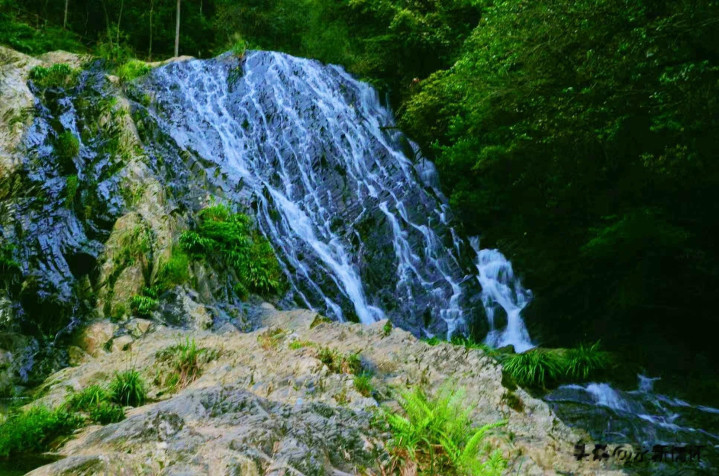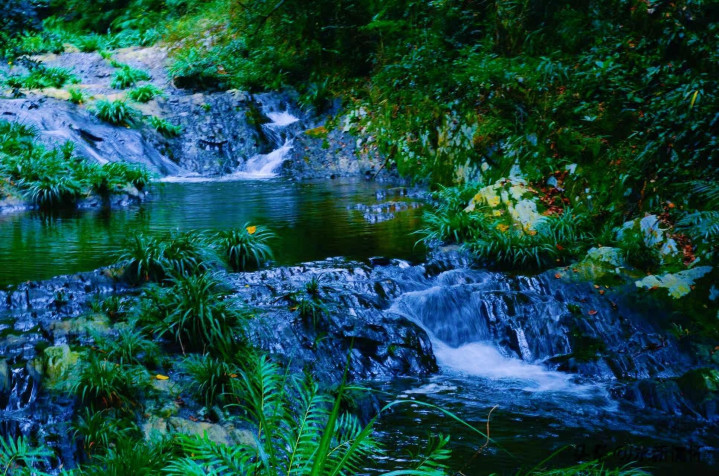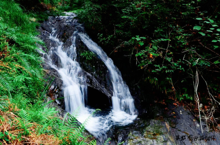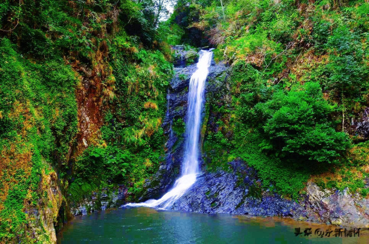我们在此驻足片刻,便循着愈发响亮的水声继续探访。谈笑间,一段贴崖修建的台阶现于眼前。正走得微喘,忽见一道白练自山涧翻滚而下,一头扎入深潭——神龙摆尾瀑布便兀自现身了。水流在山石间左冲右突,其势翩若惊鸿,其态婉若游龙,将“神龙摆尾”的灵动之姿展现得淋漓尽致。我们立于潭边,任沁凉的水汽扑面,看那道白练在山谷间挥洒自如,久久不忍移步。