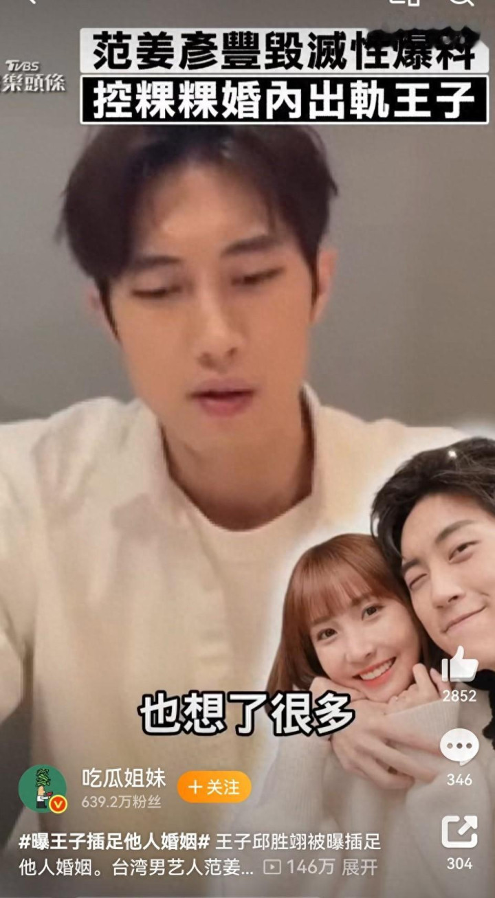 这次他是被台湾男艺人范姜彦丰实名举报,他在视频里控诉邱胜翊介入自己家庭,和自己太太粿粿有婚外情,而且他手上还有明确的出轨证据。