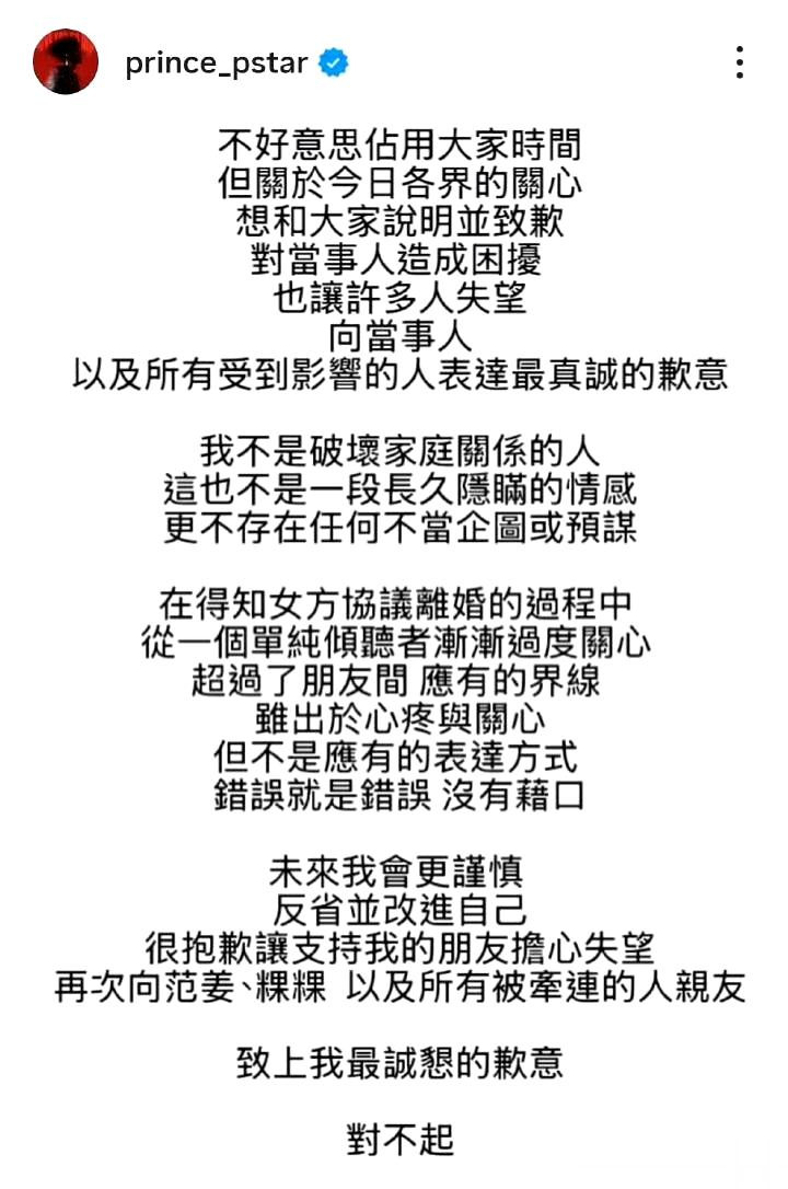 后来王子发文道歉,他说,因为女方在协议离婚,自己表达了过分的关心。网友说还在婚姻存续内,有了超过朋友界限,就是承认插足了!